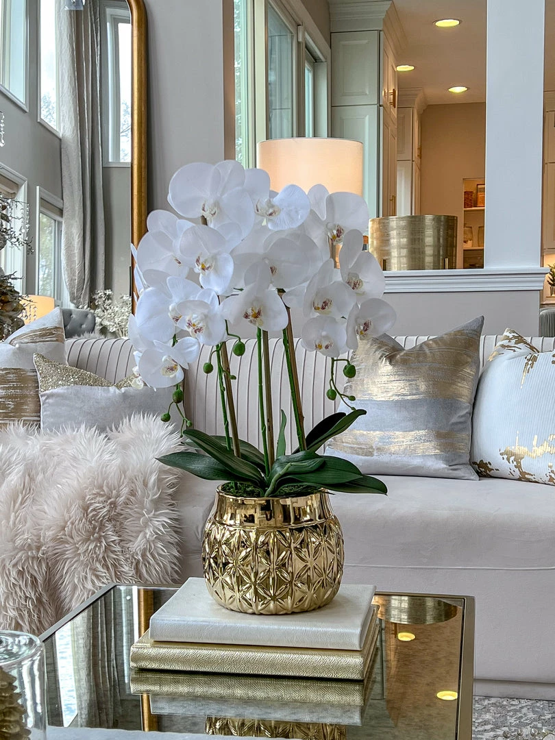 Description: This gold potted faux white Orchid is perfect for every season’s decor! The size is perfect for placing anywhere around your home!