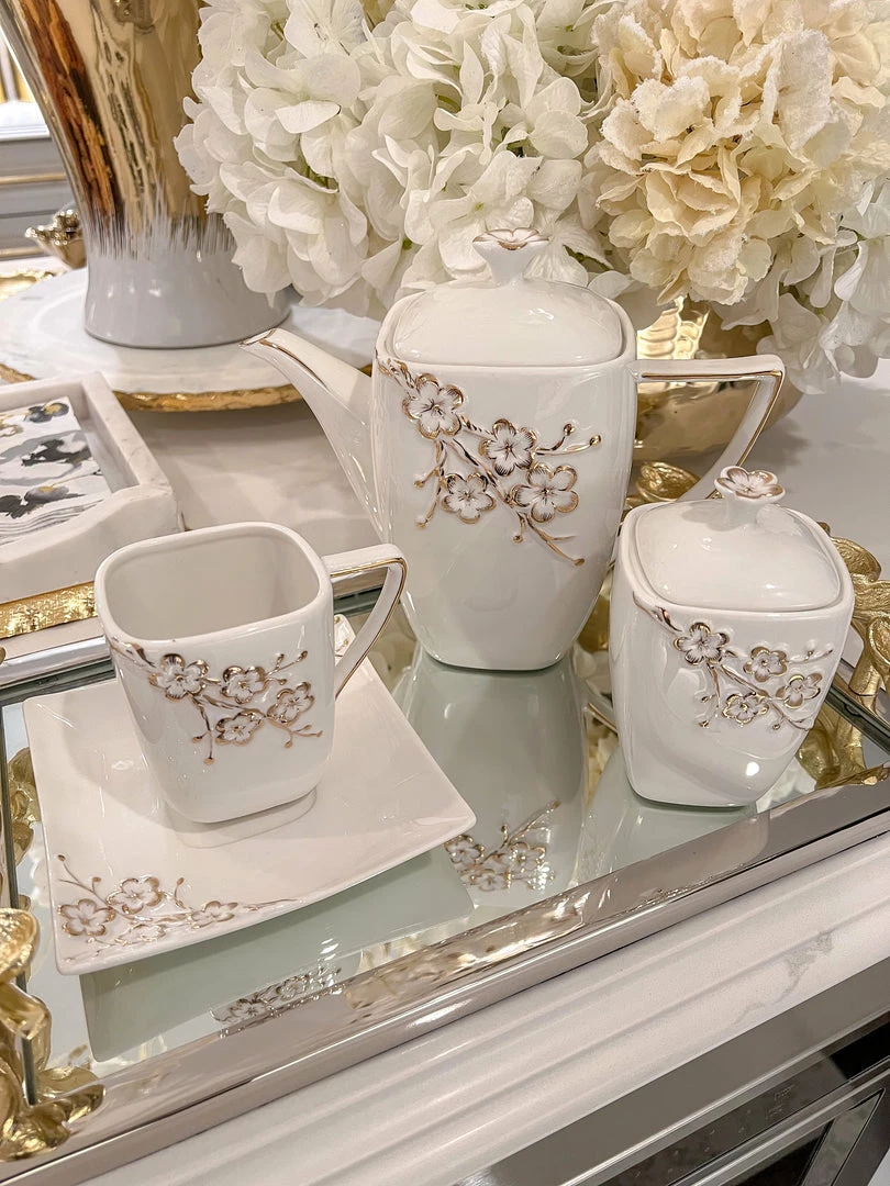 Description: The delicate white ceramic tea set with its stunning gold floral artwork will make a statement.