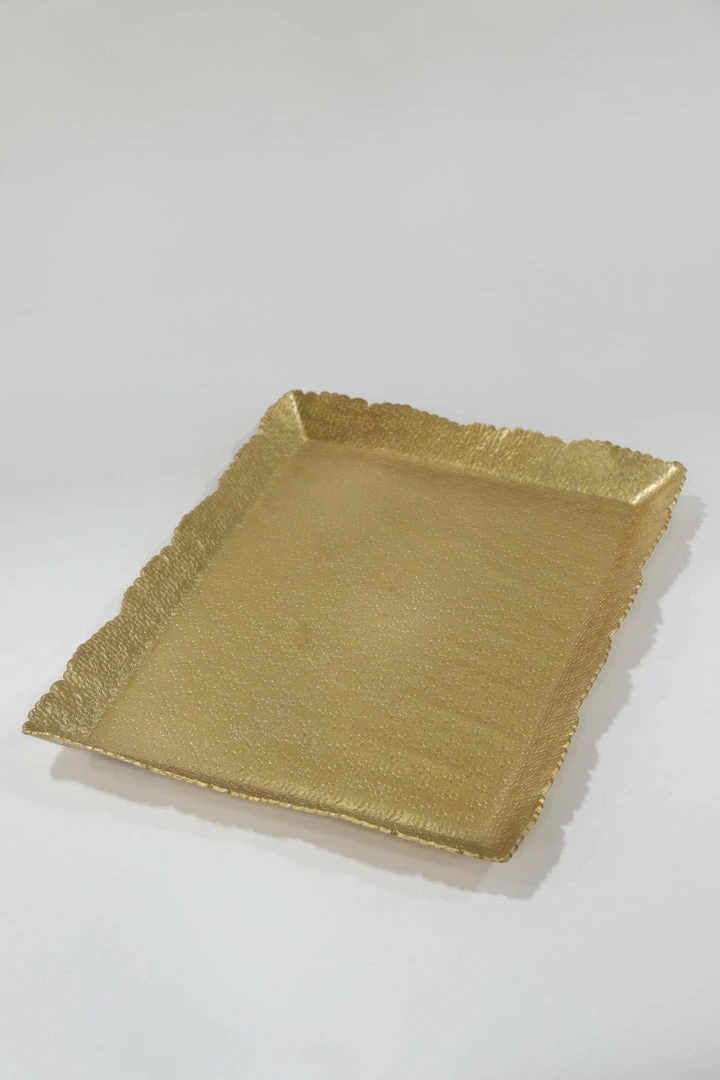 Description: This stunning textured tray is such an elegant design! The glossy gold finish is highlighted with a beautiful texture throughout the piece and the look is completely with an organic edge finish!