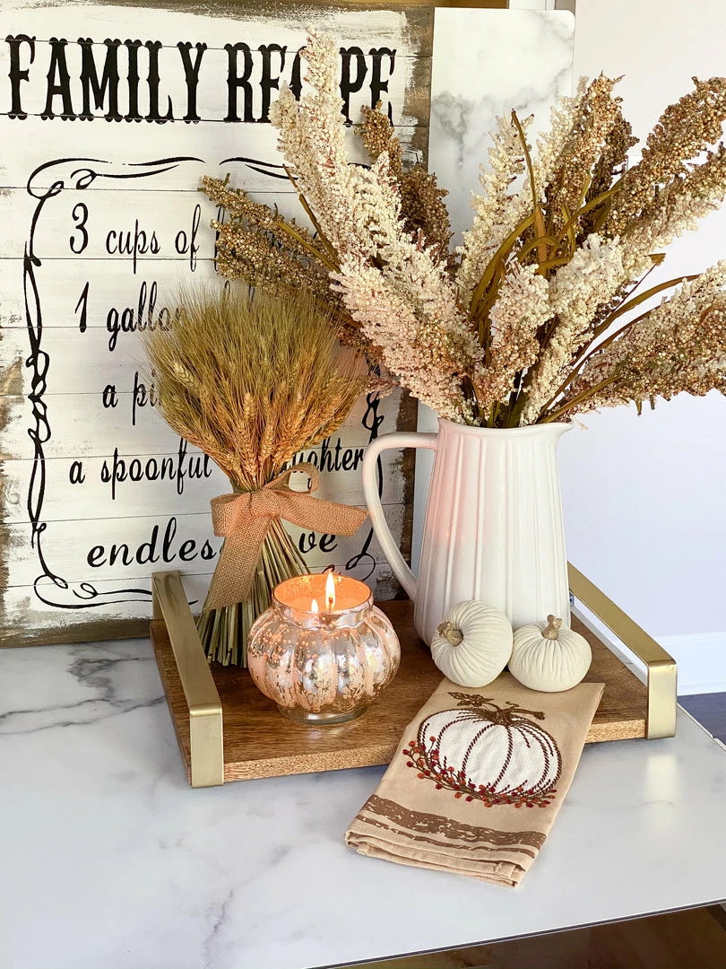 This tied, dried wheat bundle screams fall! It is such a perfect addition to your fall vignettes on your console, or in your centerpiece.