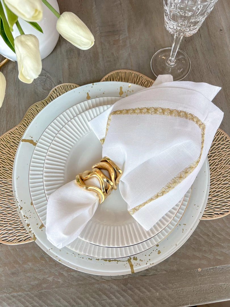 Description: These all-metal substantial wavy stacked napkin rings are absolutely stunning and will make a statement on your dining table!
