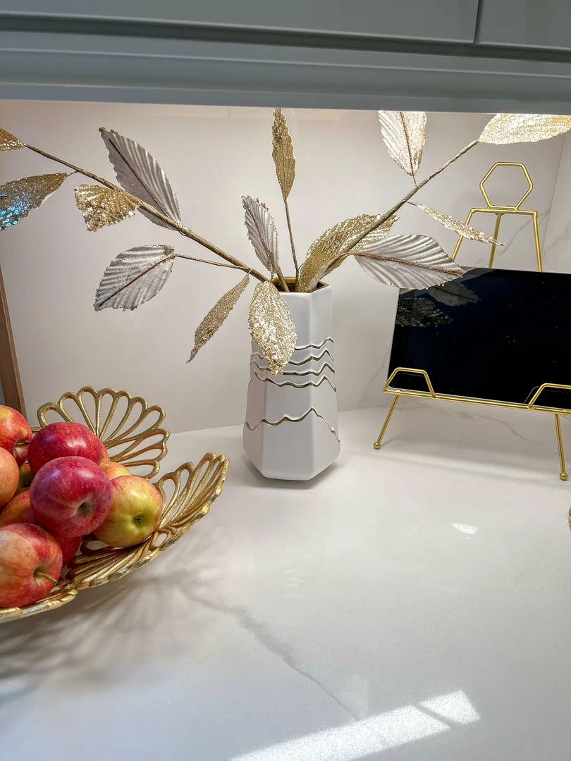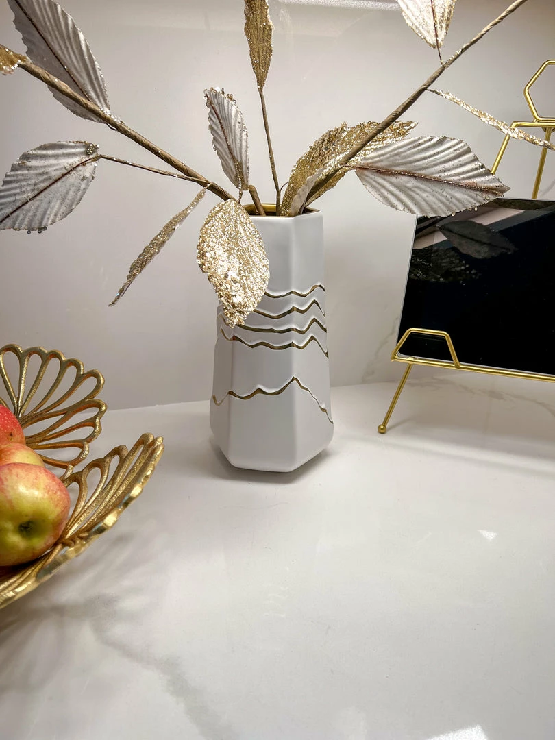 Description: We are loving this white and gold striped vase! It provides and clean and elegant look to your home! Perfect height for all your faux florals.
