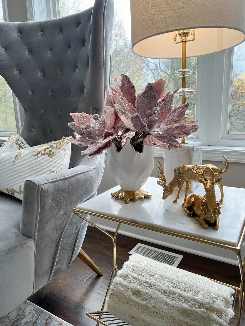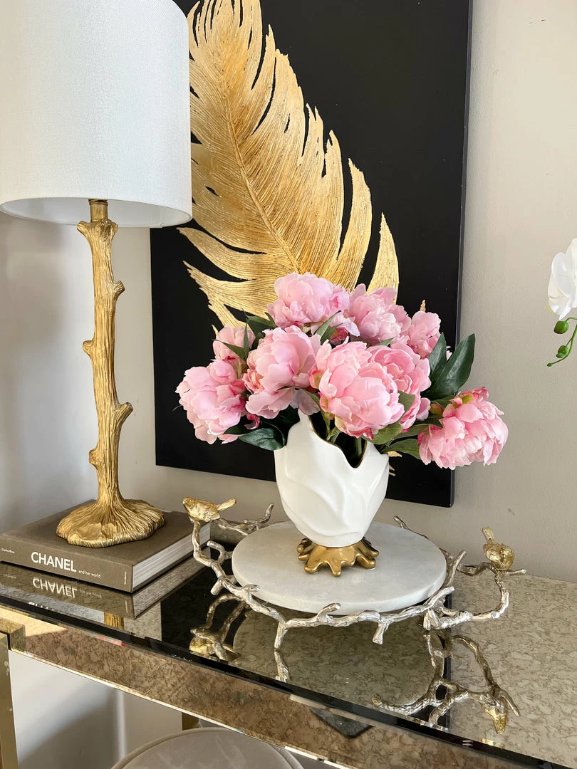 Description: This white and gold vase has a beautiful and unique style! You can style it on top of a tray and empty or you can add faux floral in the vase.