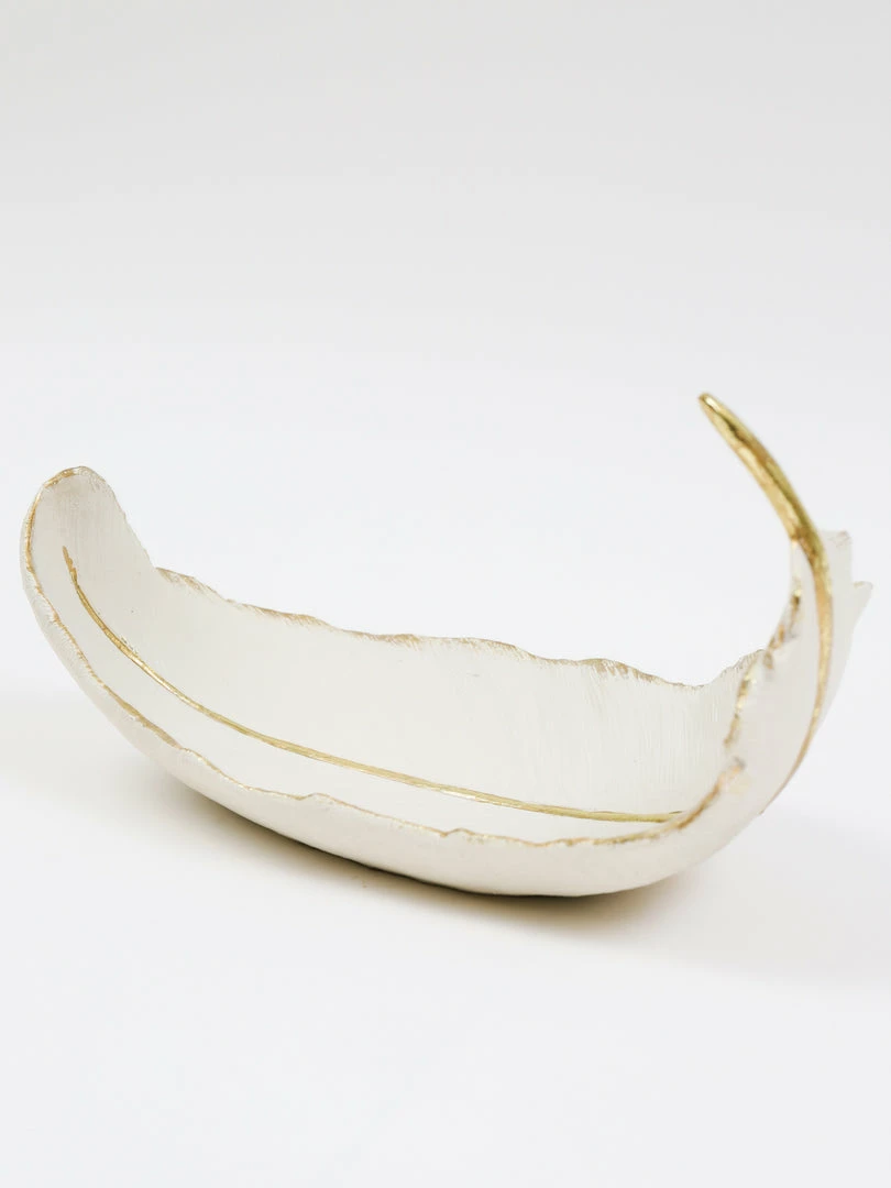 Description: This glamorous multi-textural large curved white feather sculpture bowl with a brushed metallic gold finish will make a great tray for your other smaller decor. The fine lines are carved throughout to create a soft feather texture while the stem and shallow curved edges add dimension. This is the perfect compact storage for your belongings while keeping your surface space protected.