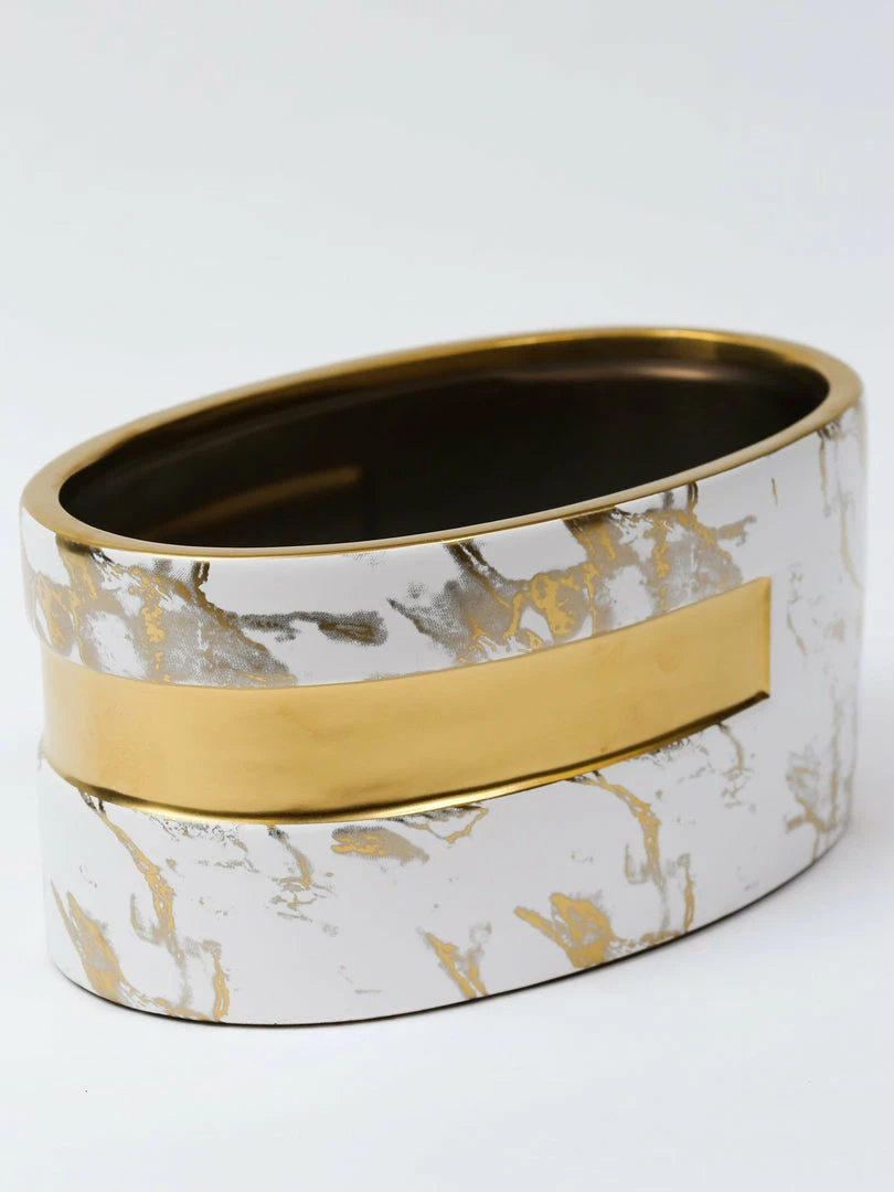 Description: This oval vase with the marble design will look great anywhere you style it. Place your favorite faux florals or even your favorite treats on your kitchen counter.
