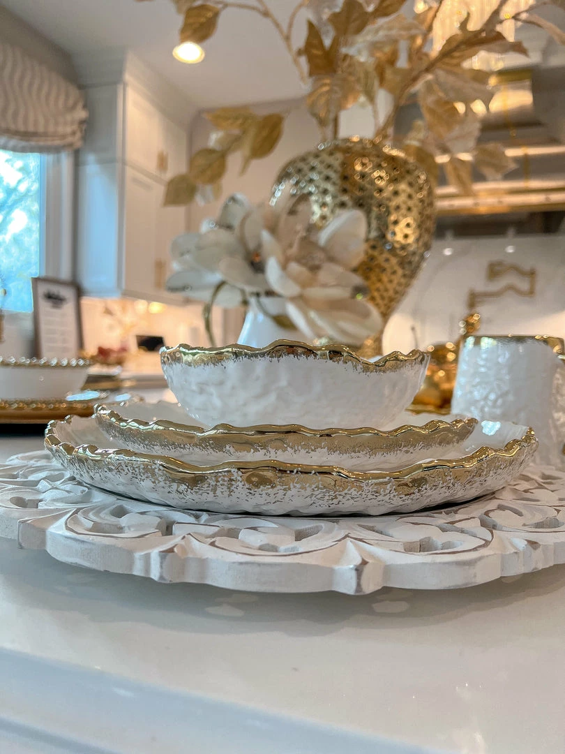 Description: This is a gorgeous gold and white dining set. It has stunning ombre golden trim which will elevate your place setting. The white base looks great on any placemat and will pair well with other colors on your dinning table!