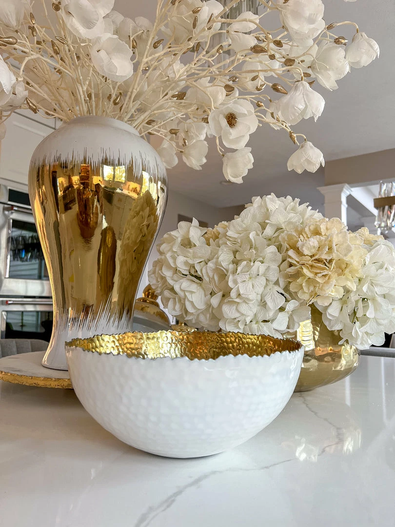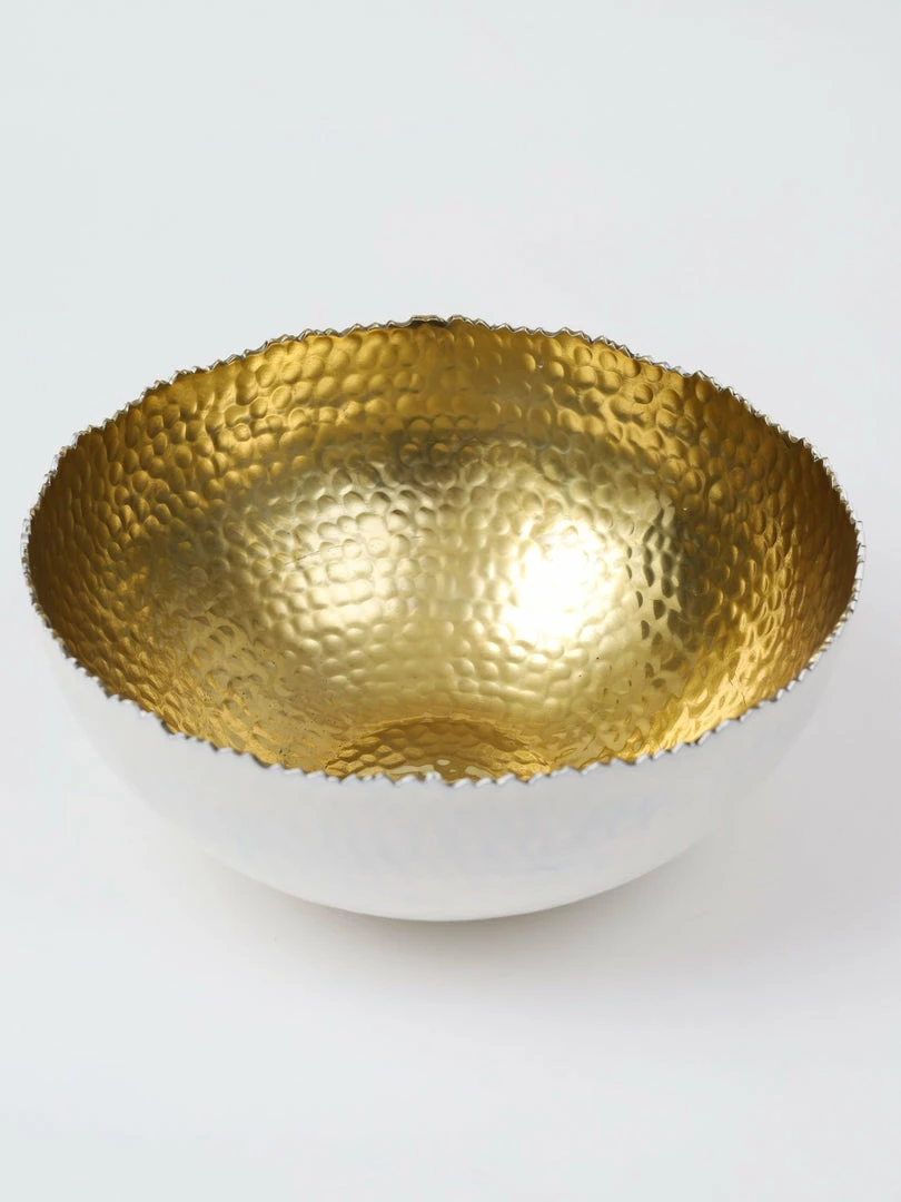 Description: This gold and white salad bowl has an uneven edge, a textured interior and exterior and will make your tablescape simply stunning.