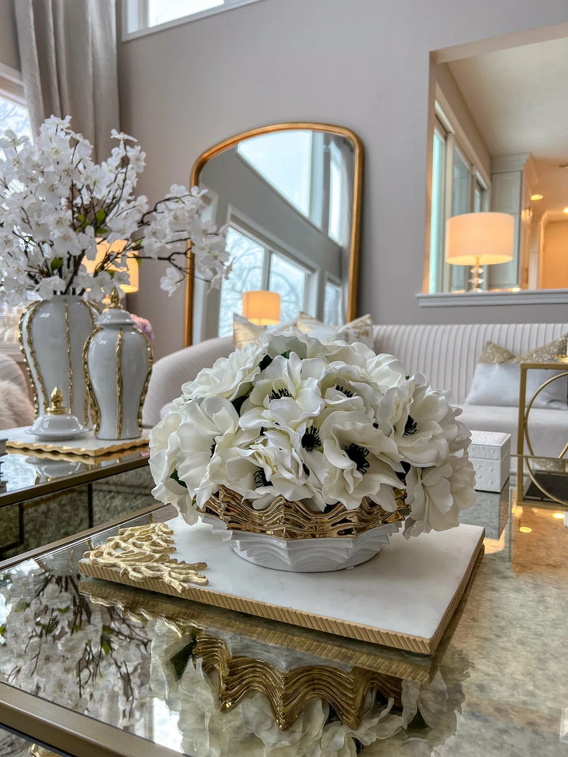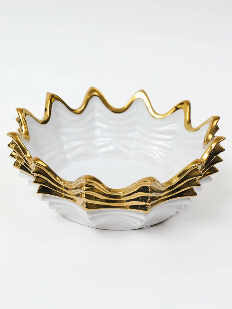 Description: This scalloped gold and white bowl will bring texture to your home! Fill it with bowl fillers or with your favorite snack.