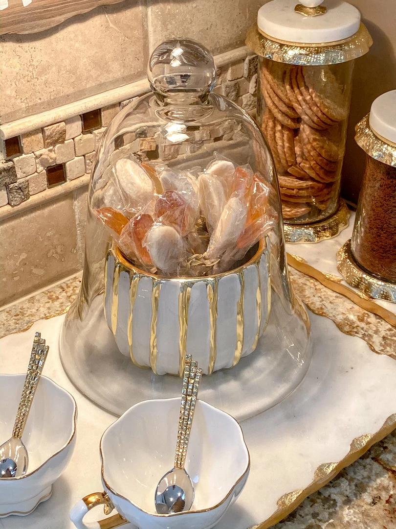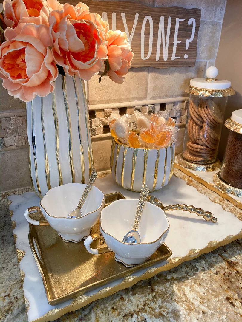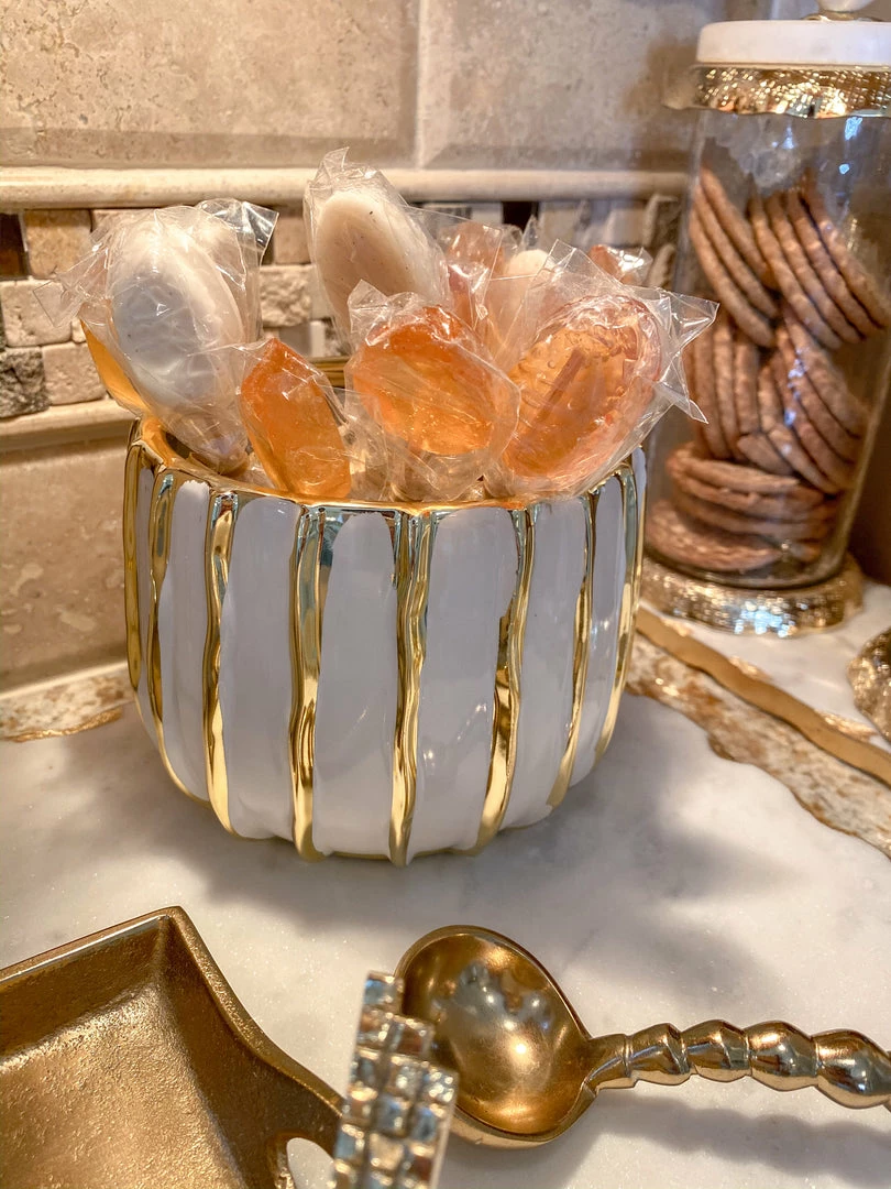 This small ceramic bowl features beautiful metallic gold stripes and ties back perfectly to the white and gold striped vase!