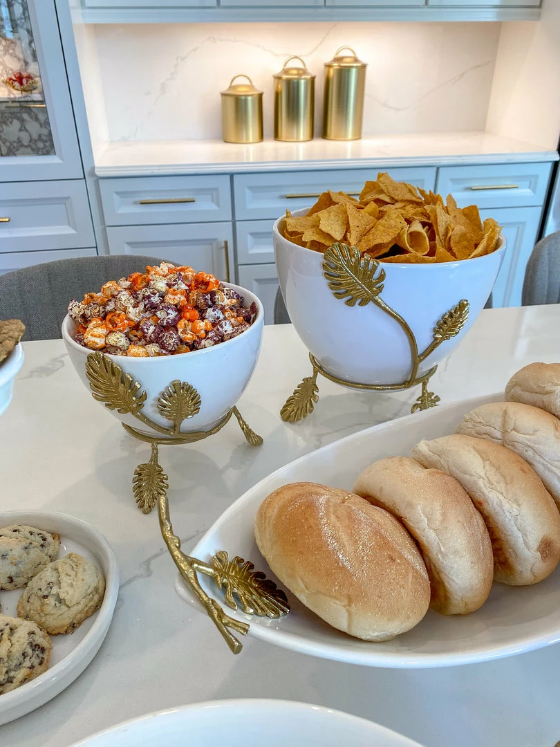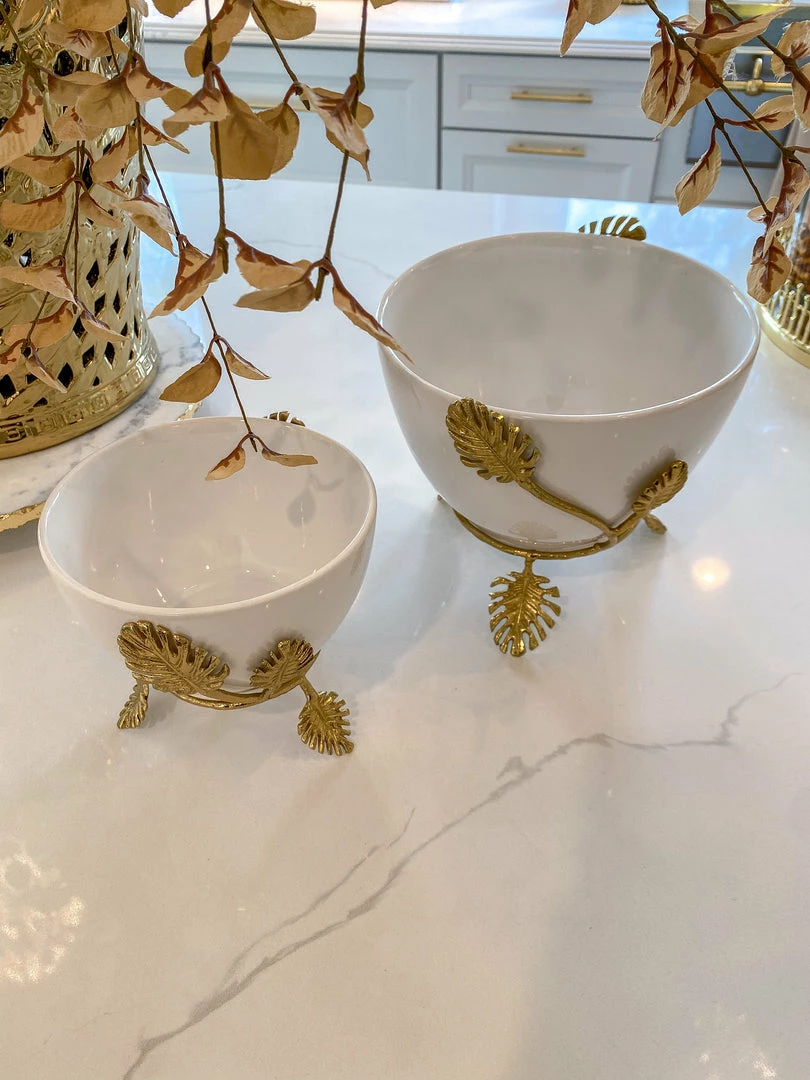 Description: This beautiful bowl is a great piece of elegant design. The gold leaves compliment the glossy white ceramic to create a timeless look of sheer elegance and glam.
