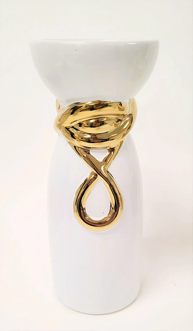 Description: This white and gold candle holder has a beautiful and unique style! These match well with our White Ceramic Jar with Elegant Gold Details, our White Bowl with Elegant Gold Details and the White Ceramic Vases with Elegant Gold Details.
