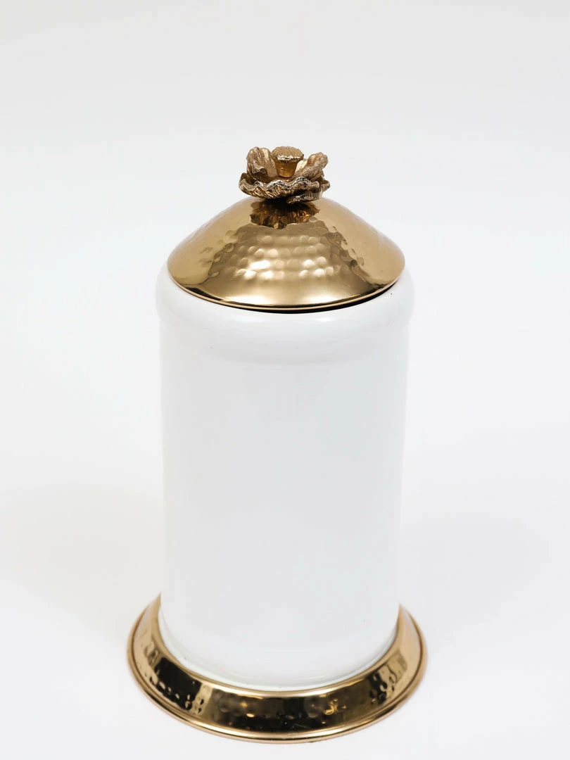 Description: These white ceramic jars feature a gold base and gold hammered lid with floral detail. These jars are such a cute addition to a coffee station or kitchen counter!