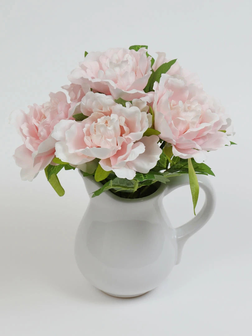 Description: This is a beautiful ceramic pitcher filled with faux pink peonies.