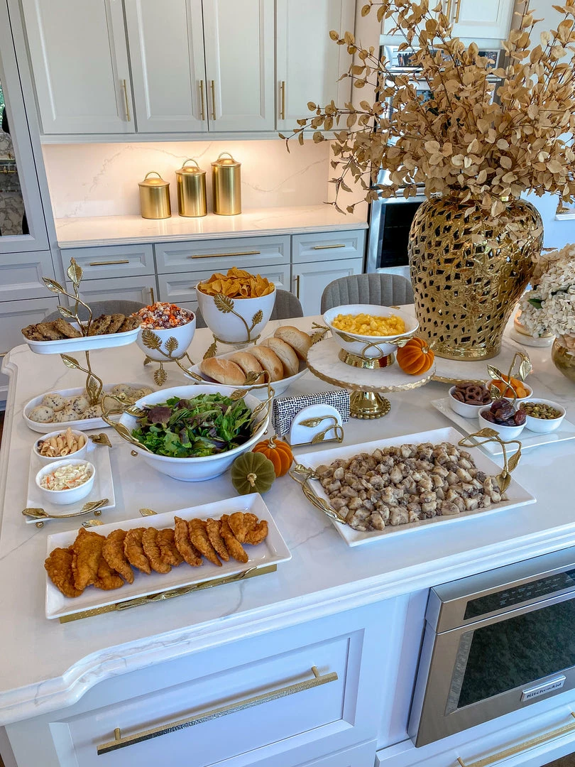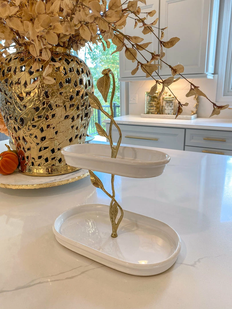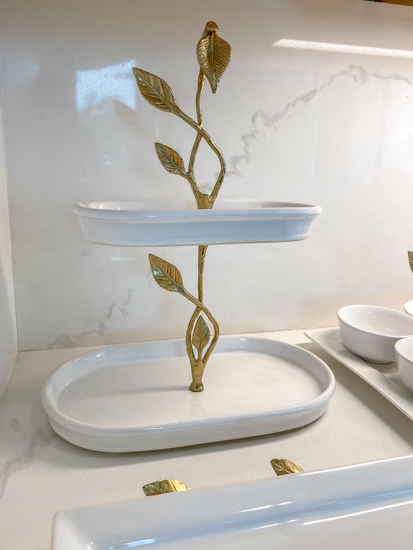 Description: This beautiful two-tiered cake stand is a great piece of elegant design. The gold leaves compliment the glossy white ceramic to create a timeless look of sheer elegance and glam.