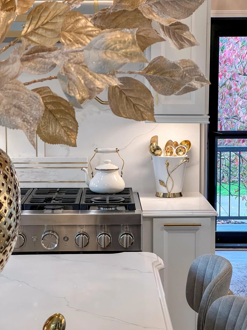 Description: This beautiful utensil holder is a great piece of elegant design. The gold leaves complement the glossy white ceramic to create a timeless look of sheer elegance and glam.