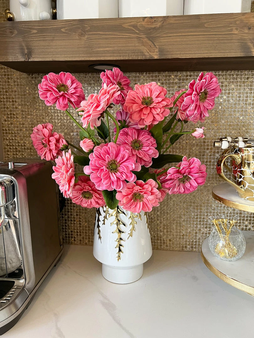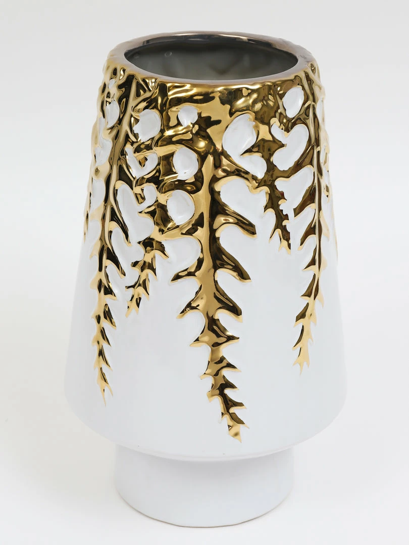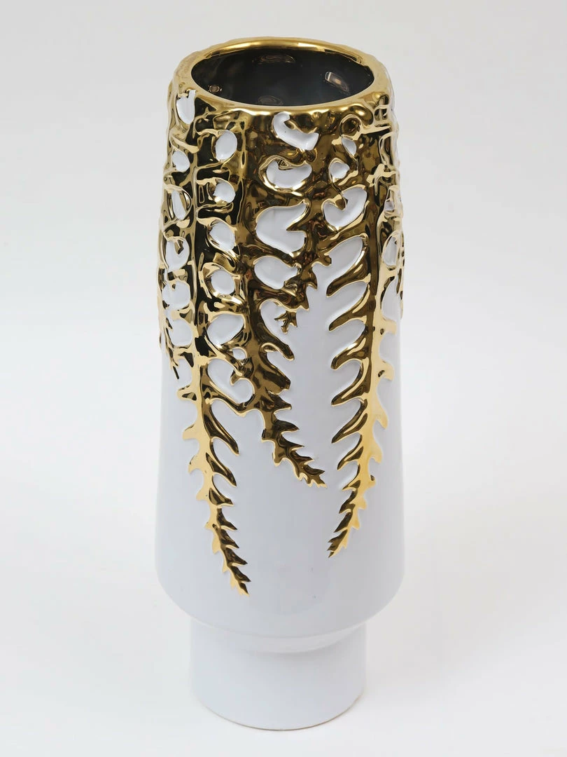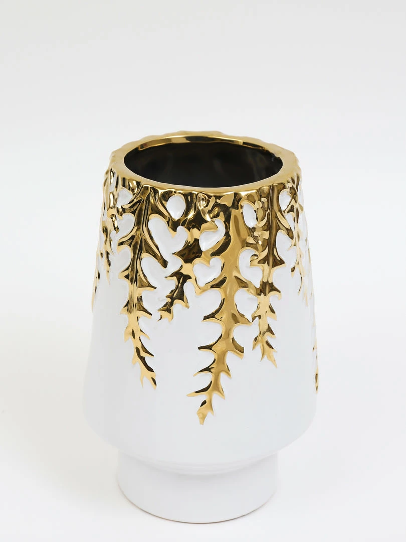 Description: This white and gold vase is substantial and will make a statement anywhere you style it. The vase has a beautiful vine design on the exterior, creating an abstract look. This design is modern and elegant in every possible way.