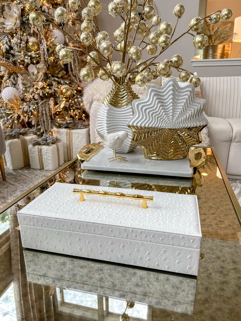 Description: This stunning white ostrich-textured faux leather lidded box is finished with a sleek gold bamboo shaped handle is the perfect place to store your remote controls. The black flannel lining is perfect to store your favorite jewelry or mementos as well.