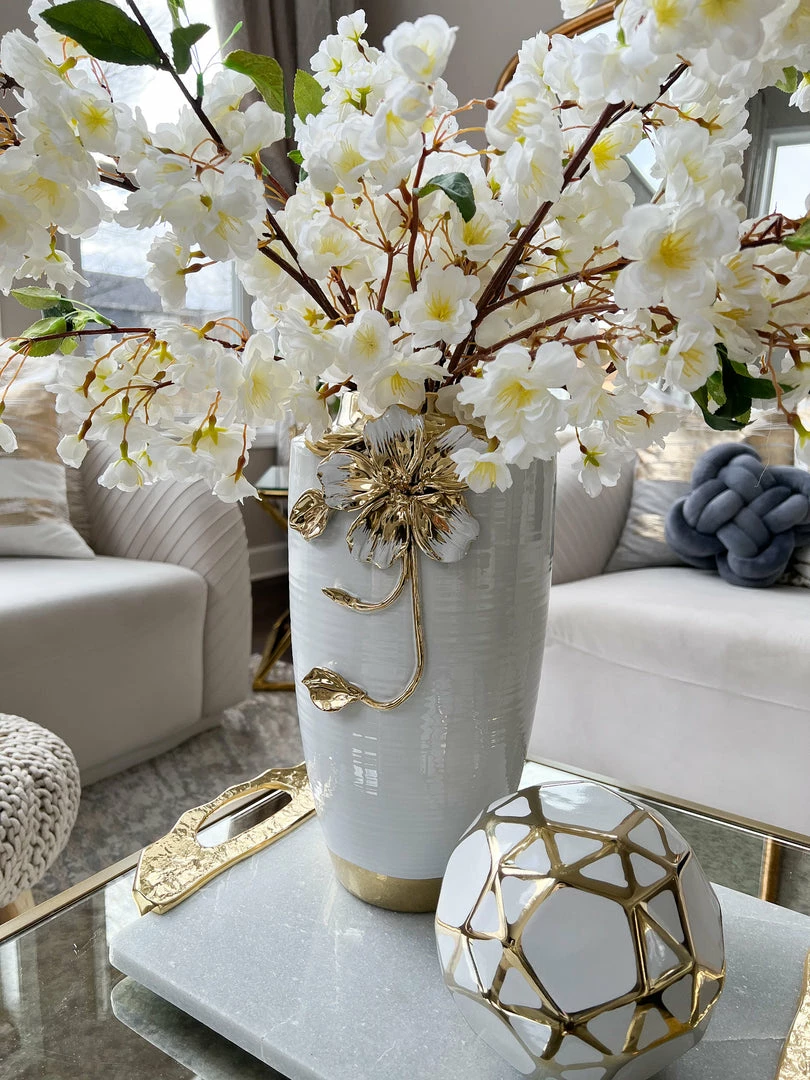 Description: This stunning vase features a gold and white intricate flower that is just stunning. We love the delicate details in the flower.