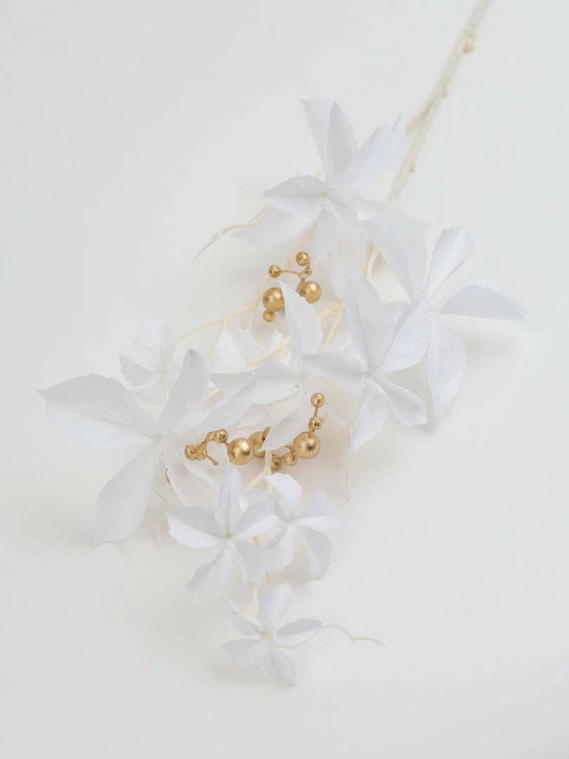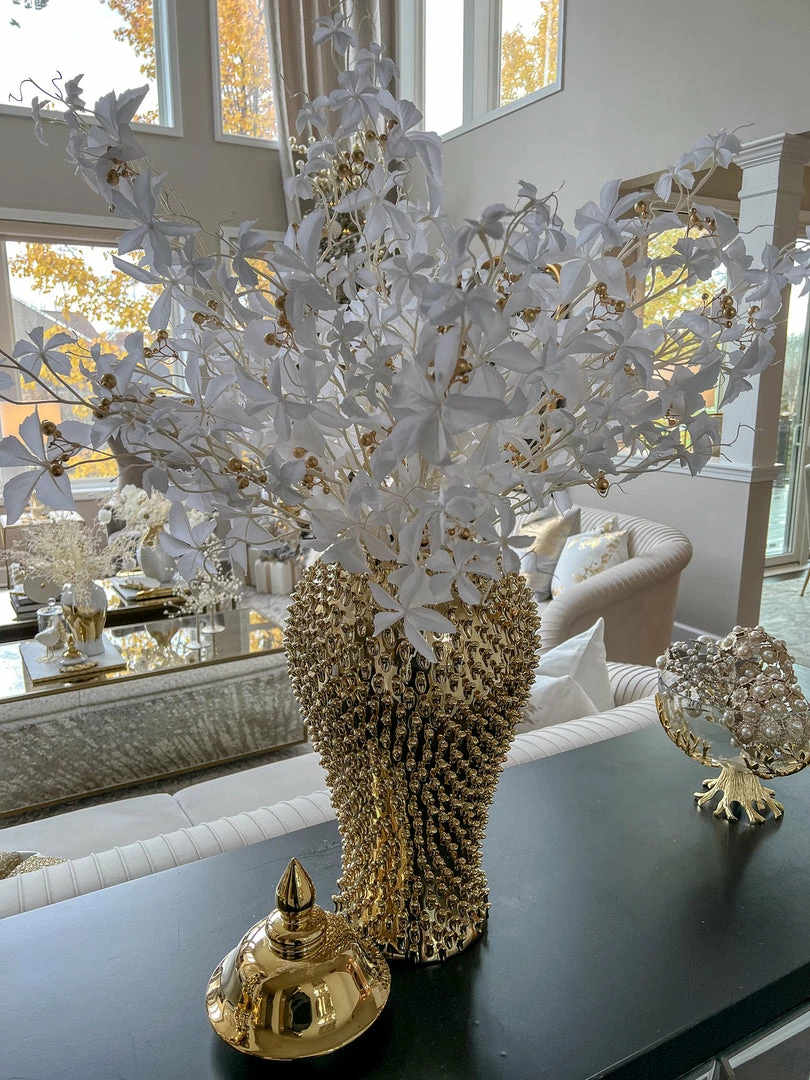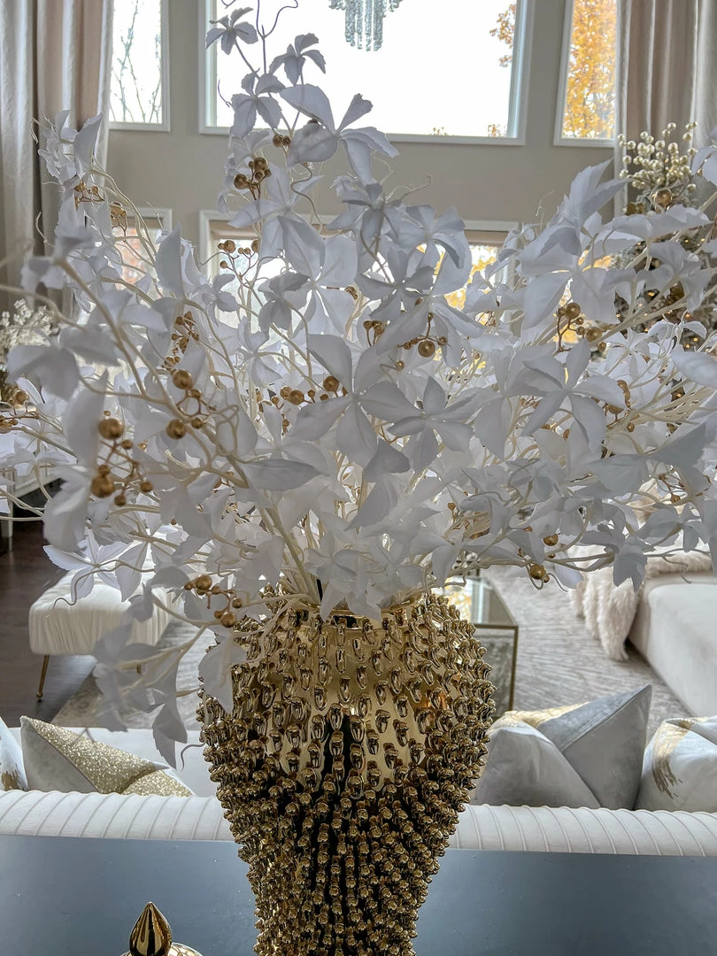 Description: This fun white stem features metallic gold berries and makes a statement in any space! We love the gold and white combination to use all year round!