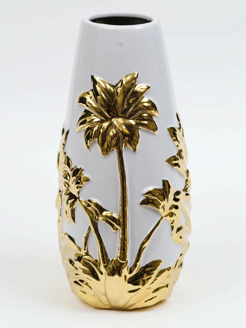 Description: This outstanding white and gold vase is amazing. The vase has palm trees on the exterior, creating an abstract look. This design is modern and elegant in every possible way.