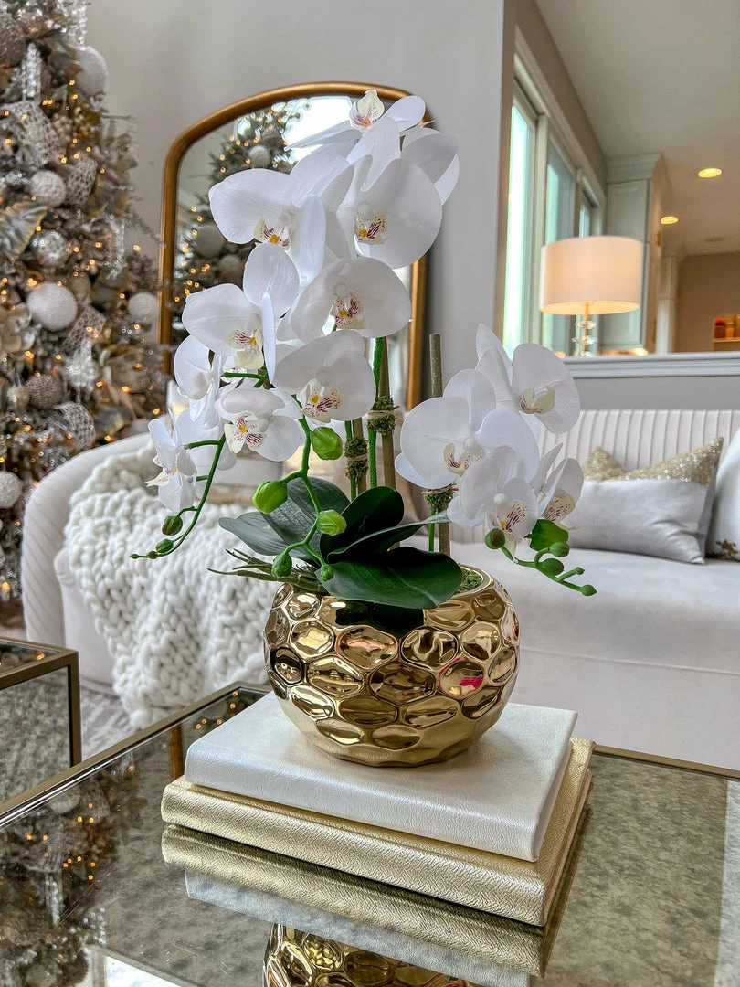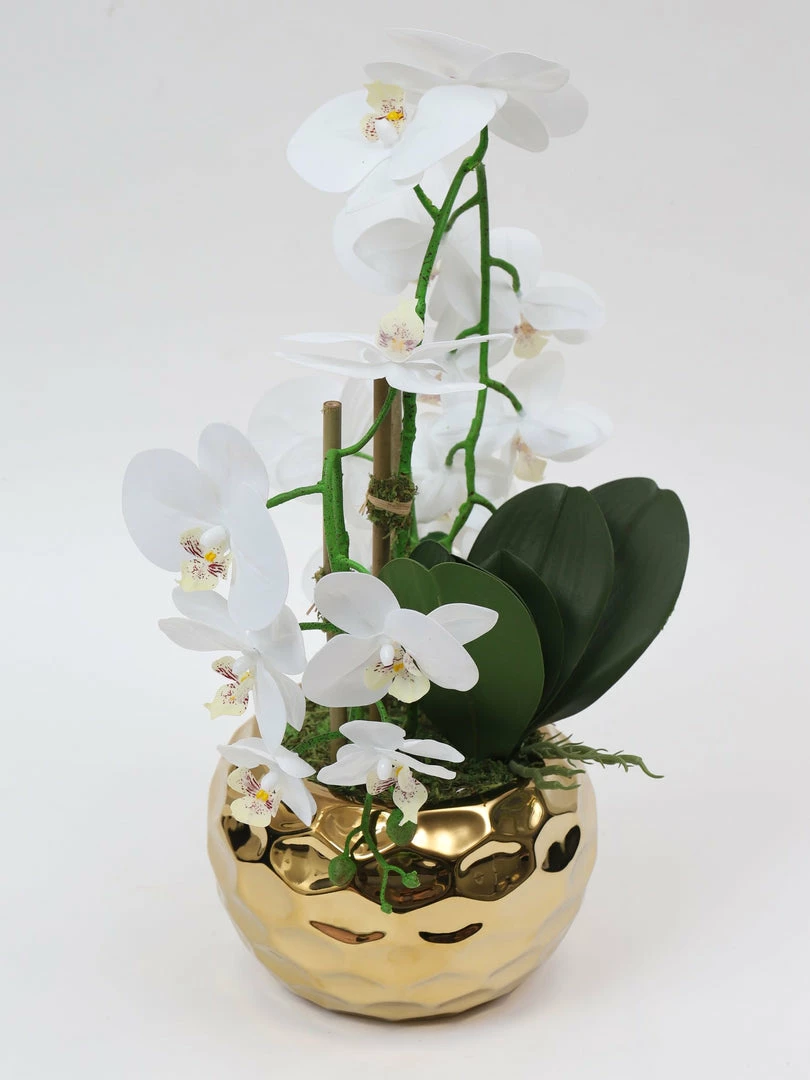 Description: This gold potted faux white Orchid is perfect for every season’s decor! The size is perfect for placing anywhere around your home!