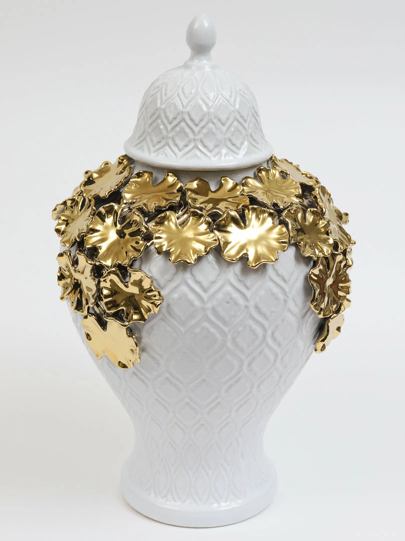Description: These white textured ginger jars with their gold floral details are simply stunning!