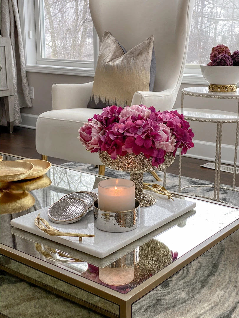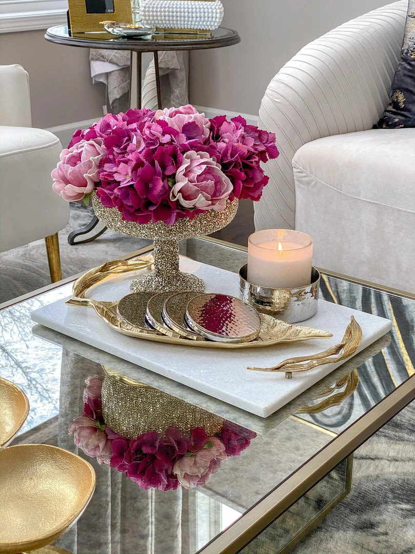 This white marble tray features beautiful gold handles shaped as thin leaves. Perfect for displaying hors d’oeuvres or other beautiful decor pieces.