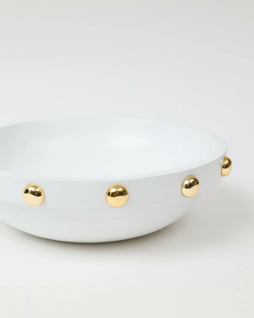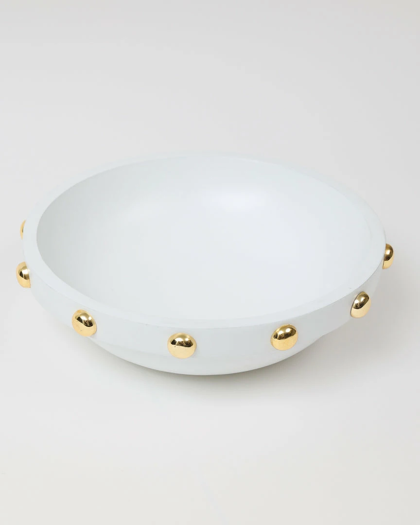 Description: This is one gorgeous white bowl with stunning gold beaded details along the top rim. You can use this for a fruit bowl or place your favorite floral orbs or stems in.