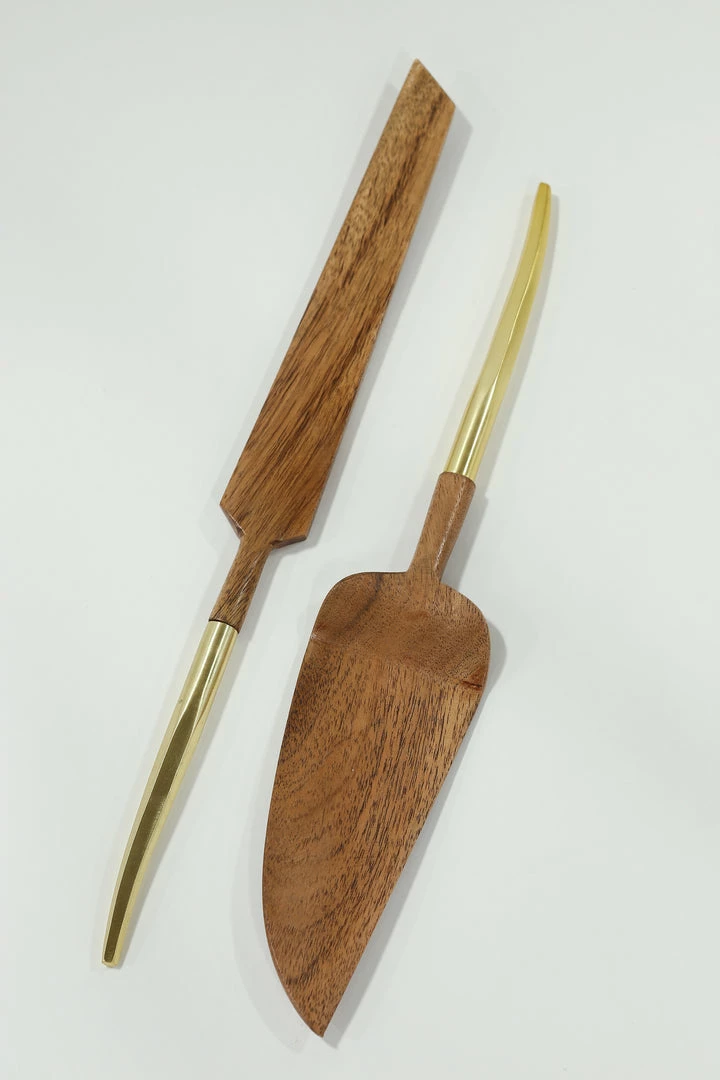 Description: These beautiful wood servers feature gold metal handles to add stunning sophistication to your serving sets!