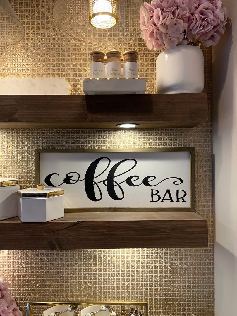 Description: This wooden sign is perfect for your coffee bar! Place it on a shelf or hang it on the wall to display.