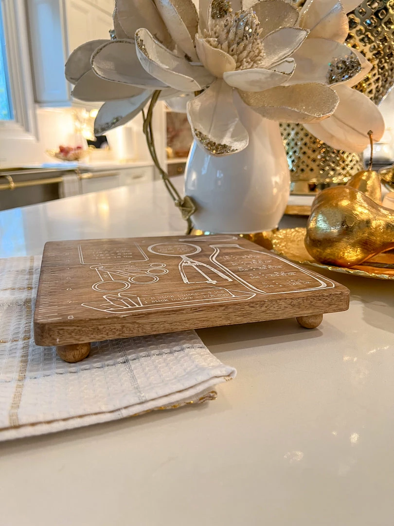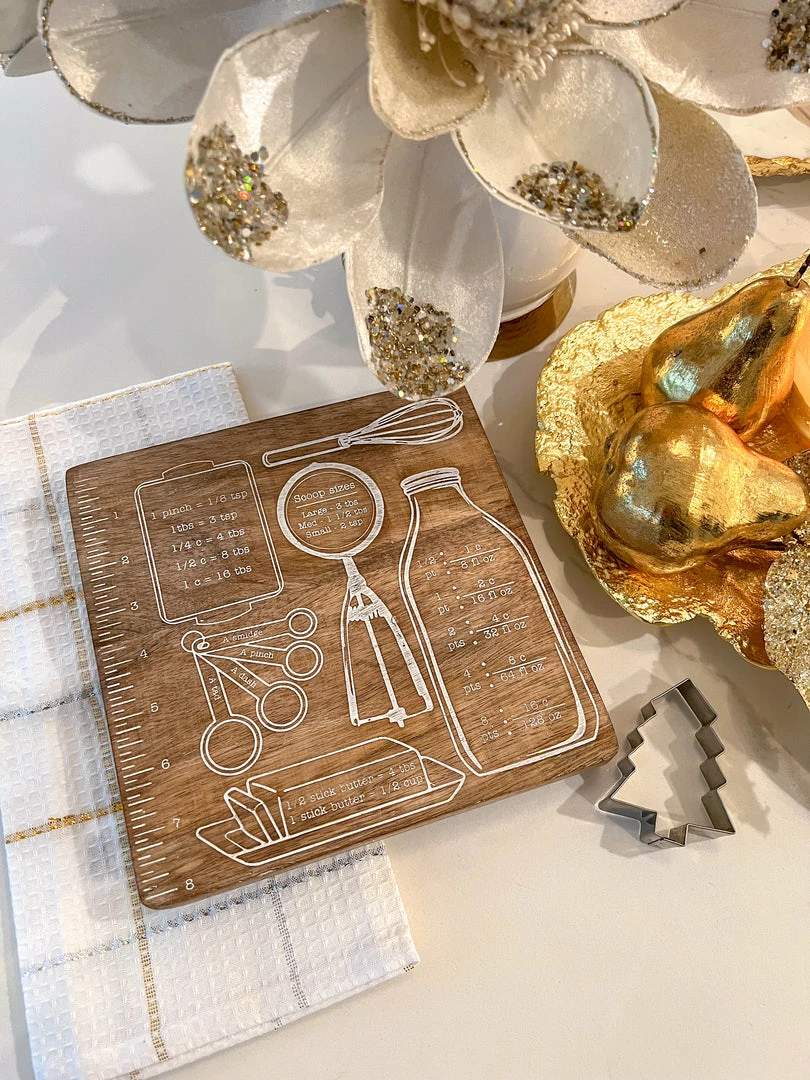 Description: Wood trivet features engraved conversions and measurement guides to help your baking this holoday season!